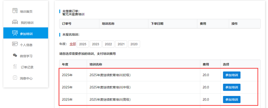 (1)左侧点击“参加培训”,右侧显示培训年度页面,点击最右侧“参加培训”选择您需要参加的培训(根据自己单位性质选择其中一种类型)。